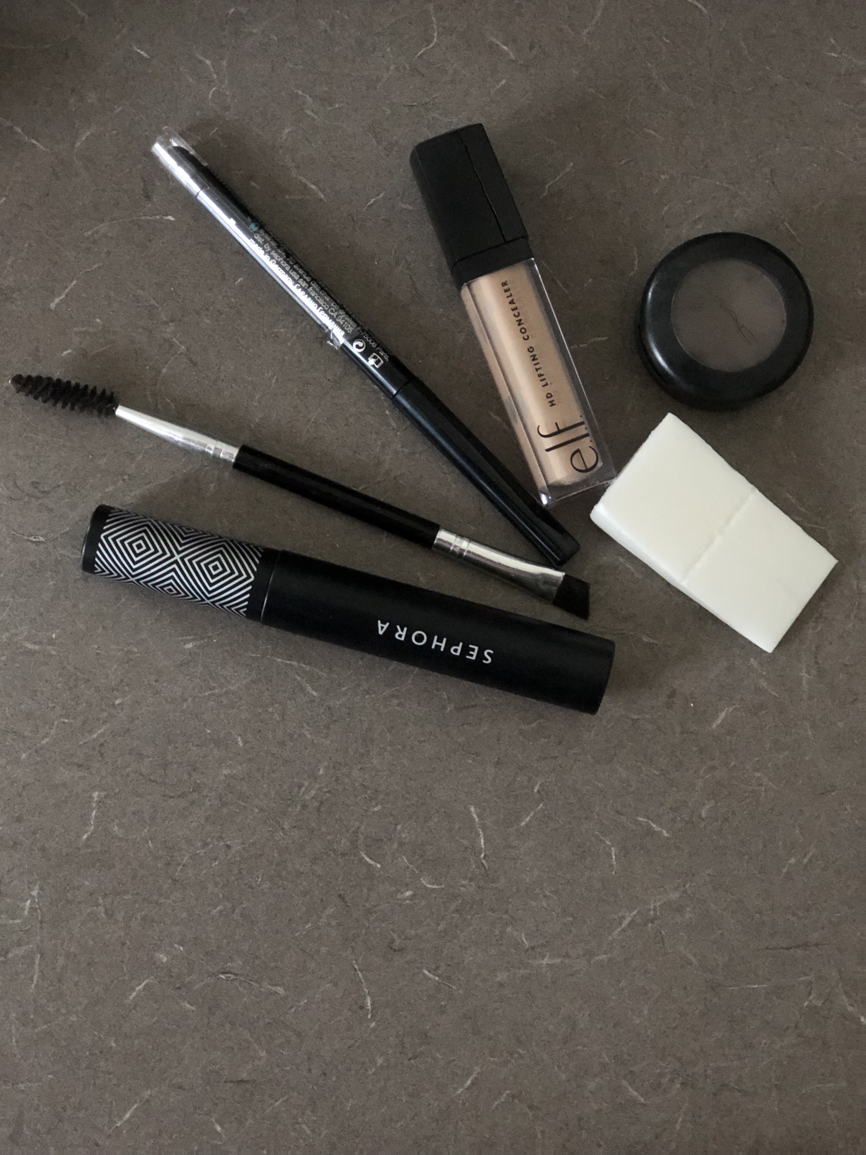 I have amazing lashes that are at times mistaken for false lashes. Now for the concearler and sponge. The concealer I use for those random bumps/ pimples but mostly for my – you guessed it!!!! eyebrows. The concealer brings them out so much more! Aside from my make up essentials I always have a pocket mirror, lotion and tweezers. The tweezers are so necessary, if you know you know.