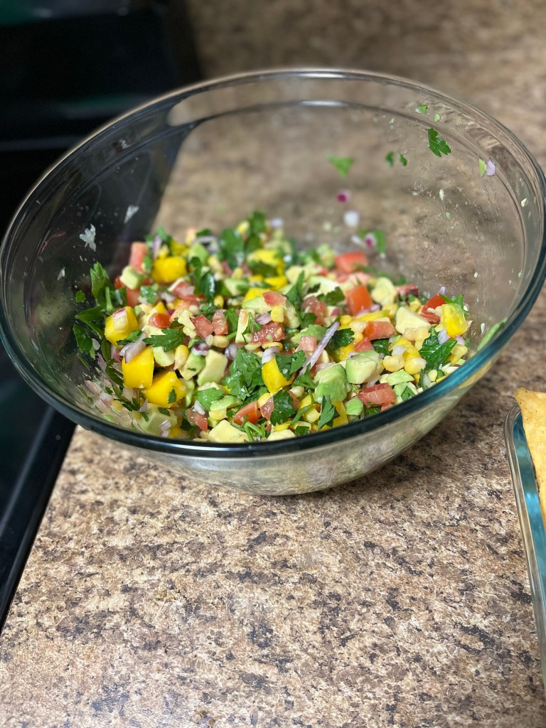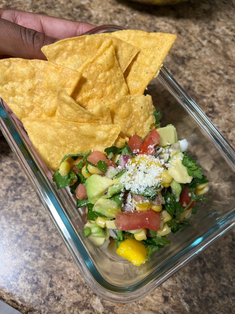 I know the importance and I definately see the value in challenging myself, trying new things, and giving myself grace in the instance where I fall short. I took my time, I was excited and I was praised my self all week for a job well done. The flavors were bursting in my mouth with every bite! The mangos and lime gave it a sweetness that balanced the spice of the onions. I purchased some amazing fresh chips from my local Mexican market that had its own flavor. The purples, greens, yellows all mixed together was like the perfect pice of art on a chip. Chefs kiss to my amazing salsa.